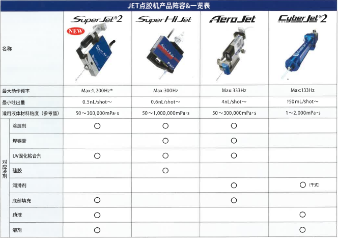 在远离工件的位置高精度地喷射液体,能实现从下方、横截面、侧面自由自在的涂布。在凹凸不平的基板和针嘴无法进入的狭小区域的涂布大有用处。不受工件的翘曲和个体差异的影响进行涂布。无需Z轴动作和间隙控制。可以超高速的处理微小点的高精度稳定涂布。可实现接触式无法实现的涂布,有助于显著提高生产效率的JET点胶机。