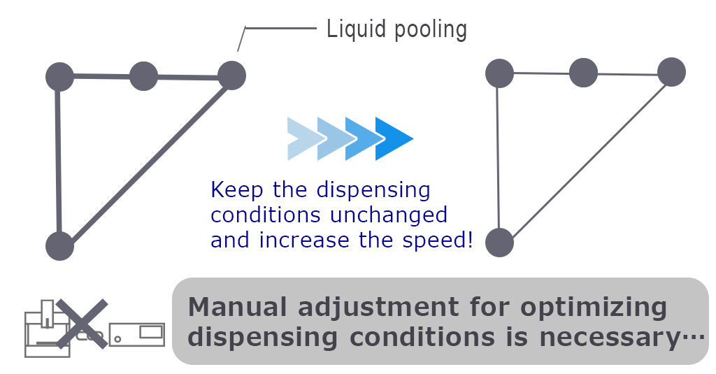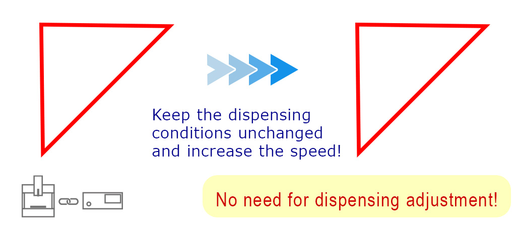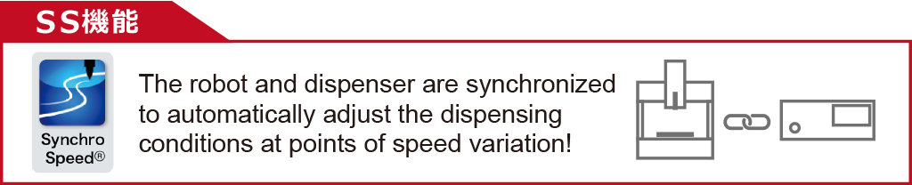 SS功能是机械臂绘制速度变动配合其用途、点胶机自动优化吐出条件的机能。绘图速度变动的情况下,速度上升的话点胶会变细,速度下降的话点胶会变粗。