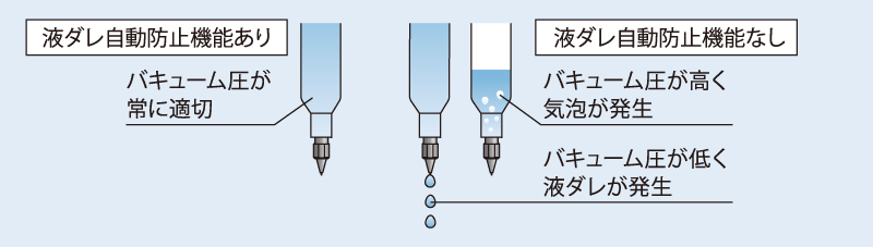 自动防滴功能可根据流体剩余量自动调节真空压力,防止喷嘴滴落和空气卷入,有助于提高生产效率和质量。