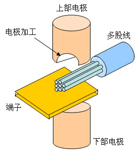 制造电子机器时会经常用到多股线与端子的焊接。为了不使芯线飞散而将电极加工成半圆形的沟槽状。多股芯线焊接的同时与端子焊接在一起。